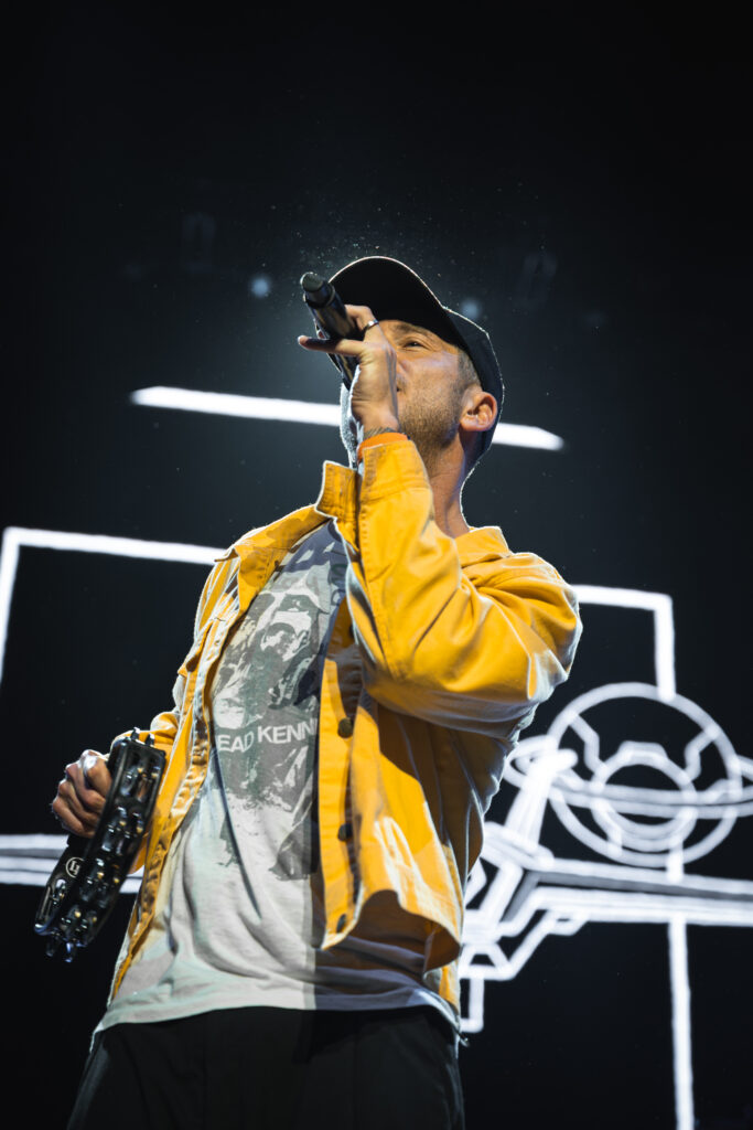 Les lumières s’éteignent sur l’Accor Hotels Arena bien complète cette fois-ci. L’intro monte, le décor se dévoile dans un bain de LED et de pulsations. OneRepublic déboule sur scène avec Born, Ryan en haut d’une plateforme apparaissant sous les cris et les applaudissements : première claque visuelle et sonore de la soirée. D’emblée, le ton est donné : riffs tranchants, batterie précise, voix habitée et émotion bien présente.
